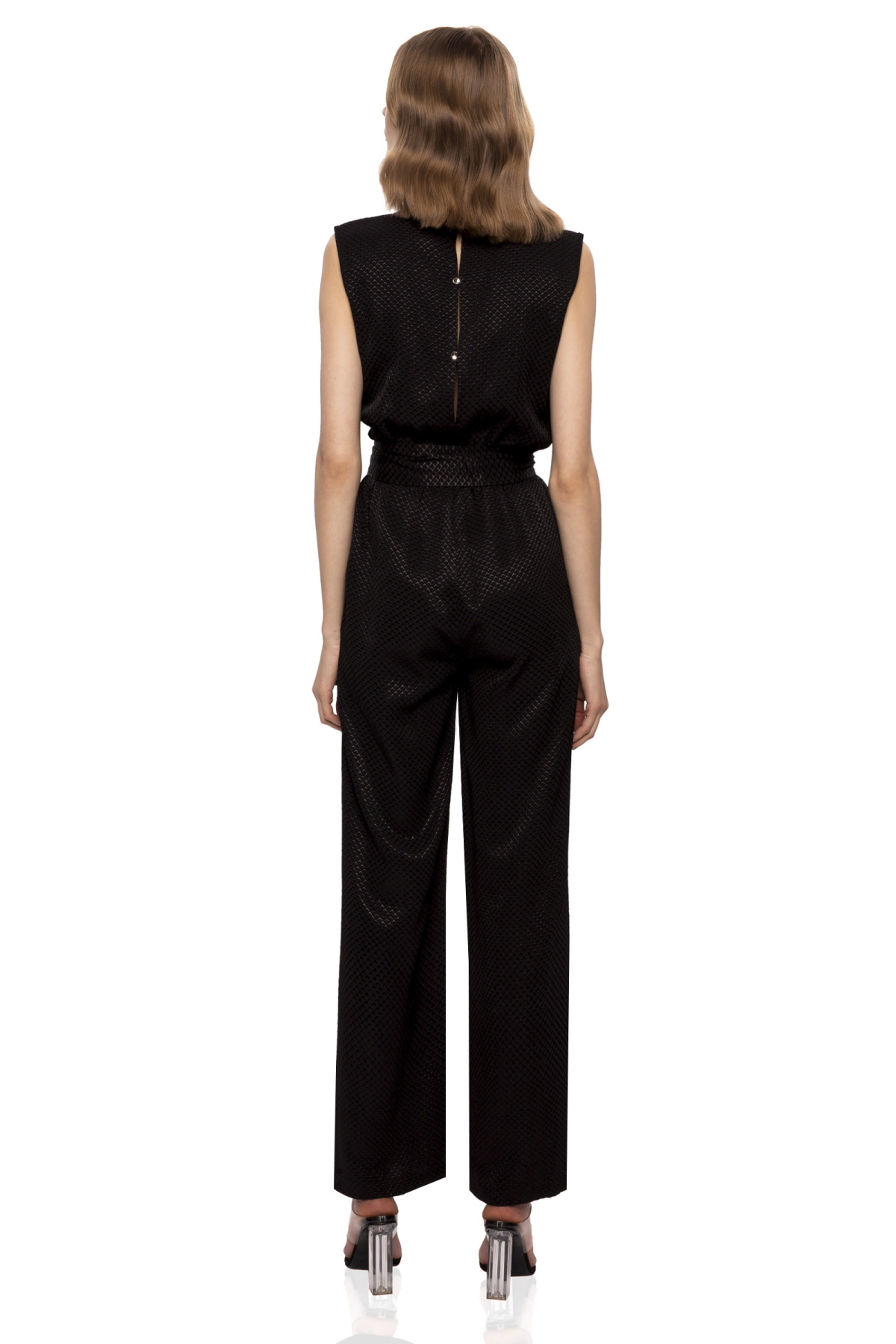 Product description Textured material jumpsuit. Cordon in the waist and vertical ruffles on the bust. Keyhole neckline and pockets.