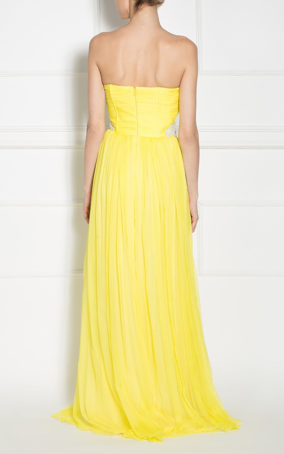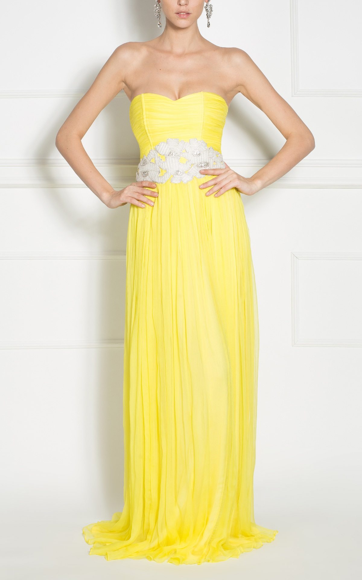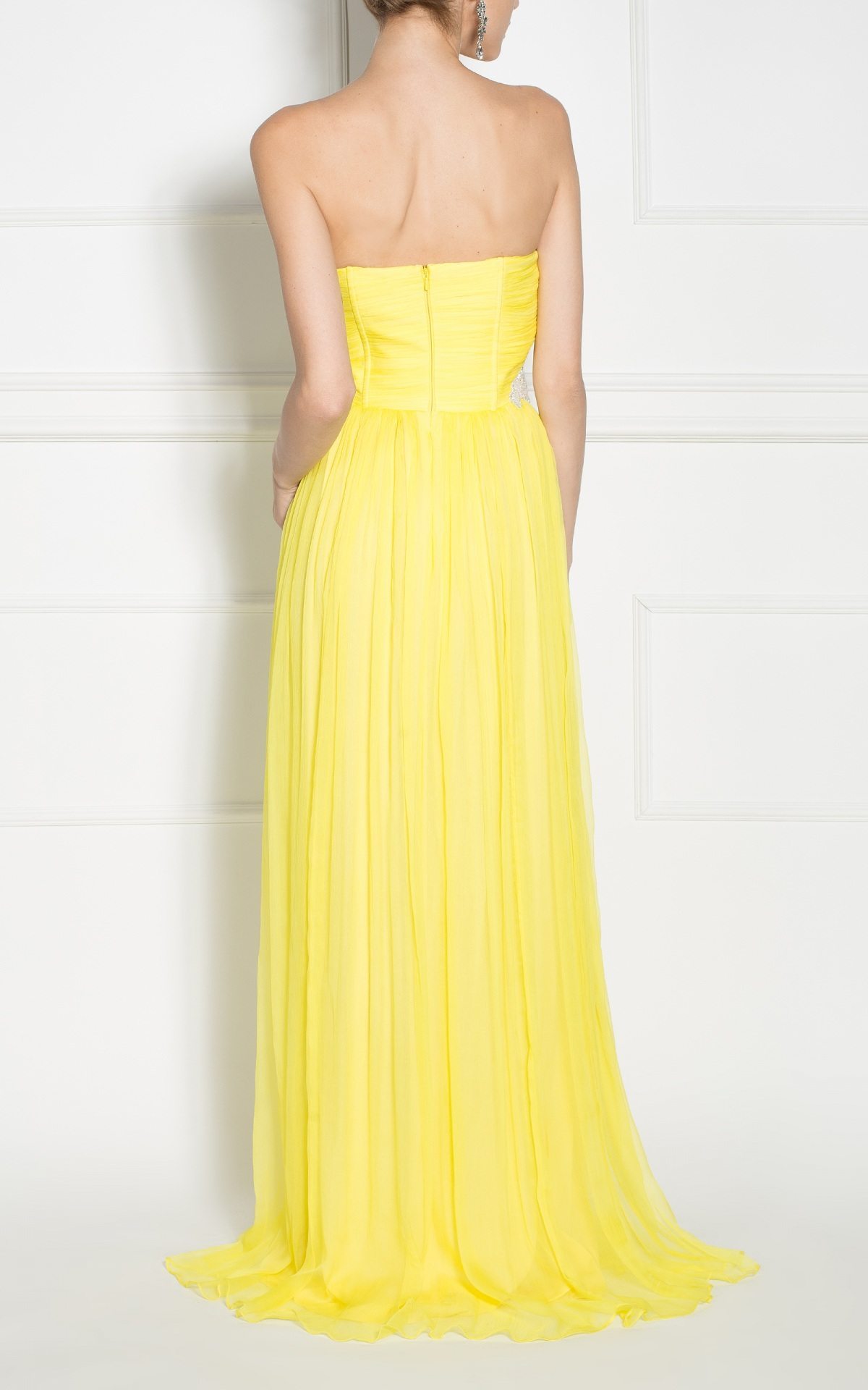 When you want to shine, you need a dress that completes you and highlights your presence. A maxi silk dress, with crimpy waistband, highlighted by the corset and applied crystal embroidery. Accessorize your outfit with chandelier earrings and wear high-heeled sandals.