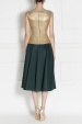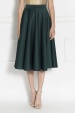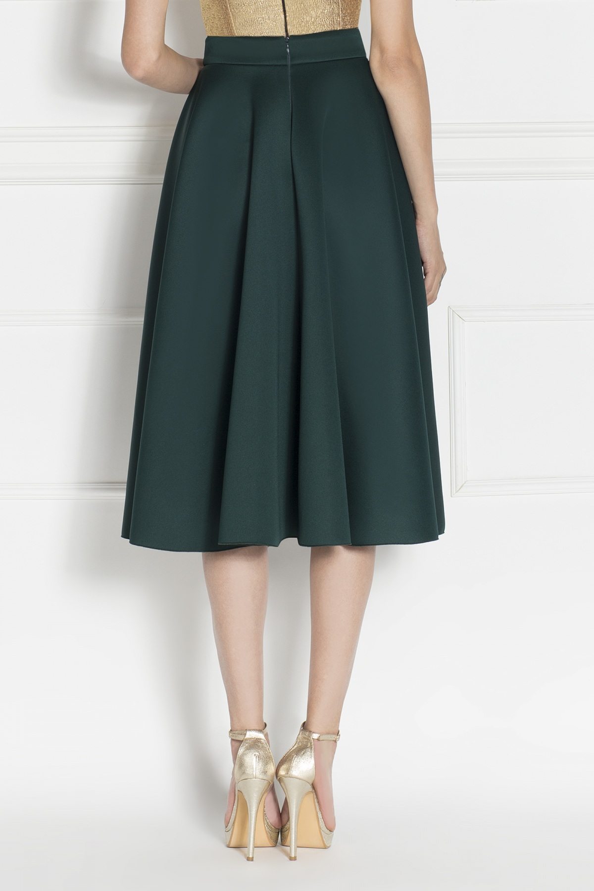 “A” shape midi skirt fits perfectly on the waist and creating the folds idea, emphasizing the body lines. Accessorize it with a top of contrasting shade, tall boots and a blazer with personality, to outline better the entire outfit.