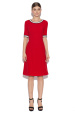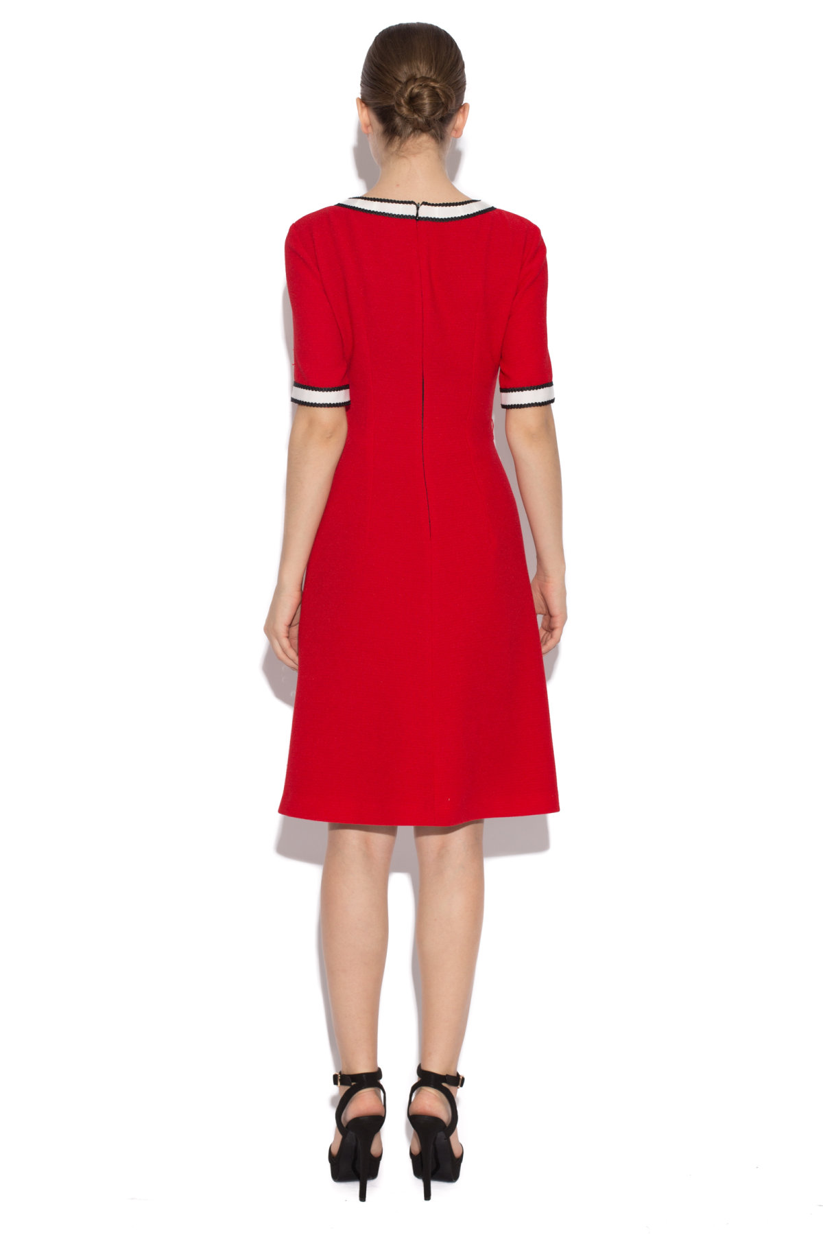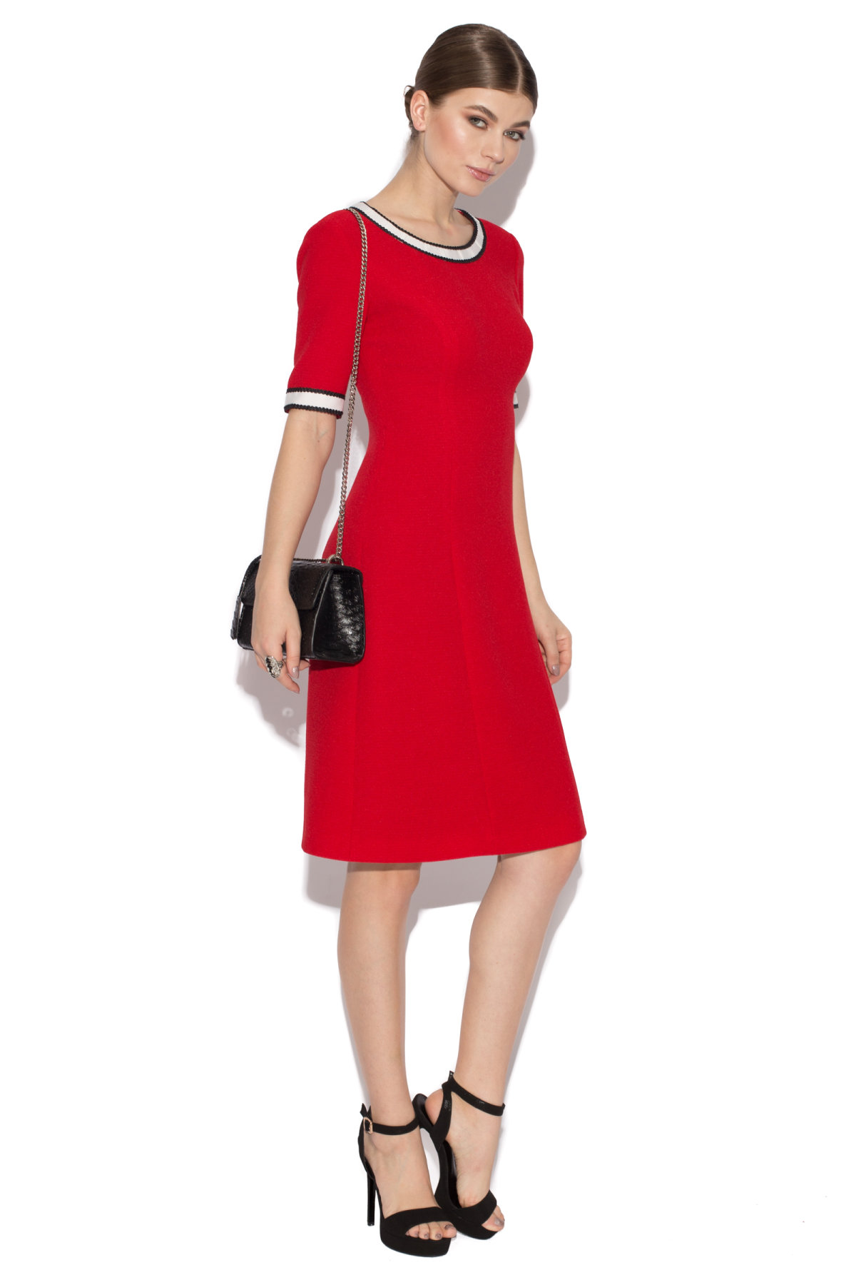 O rochie atat pentru birou, cat si pentru diversele ocazii elegante din viata ta. Rochia are un decolteu rotund, cu detaliu la maneci si gat, alaturi de pliuri in zona abdomenului si lungime pana la genunchi.