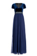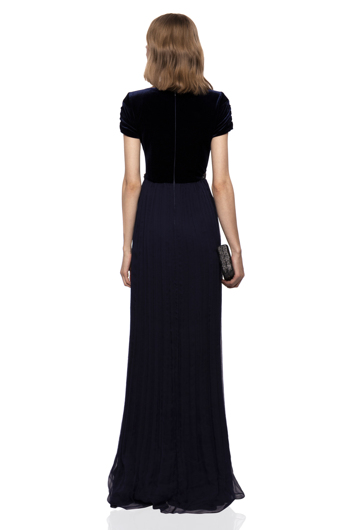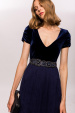 Detalii produs Rochie lunga, cu top din catifea si fusta din matase. Banda stralucitoare in talie
