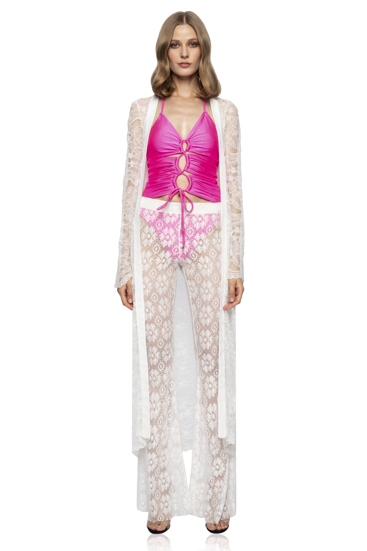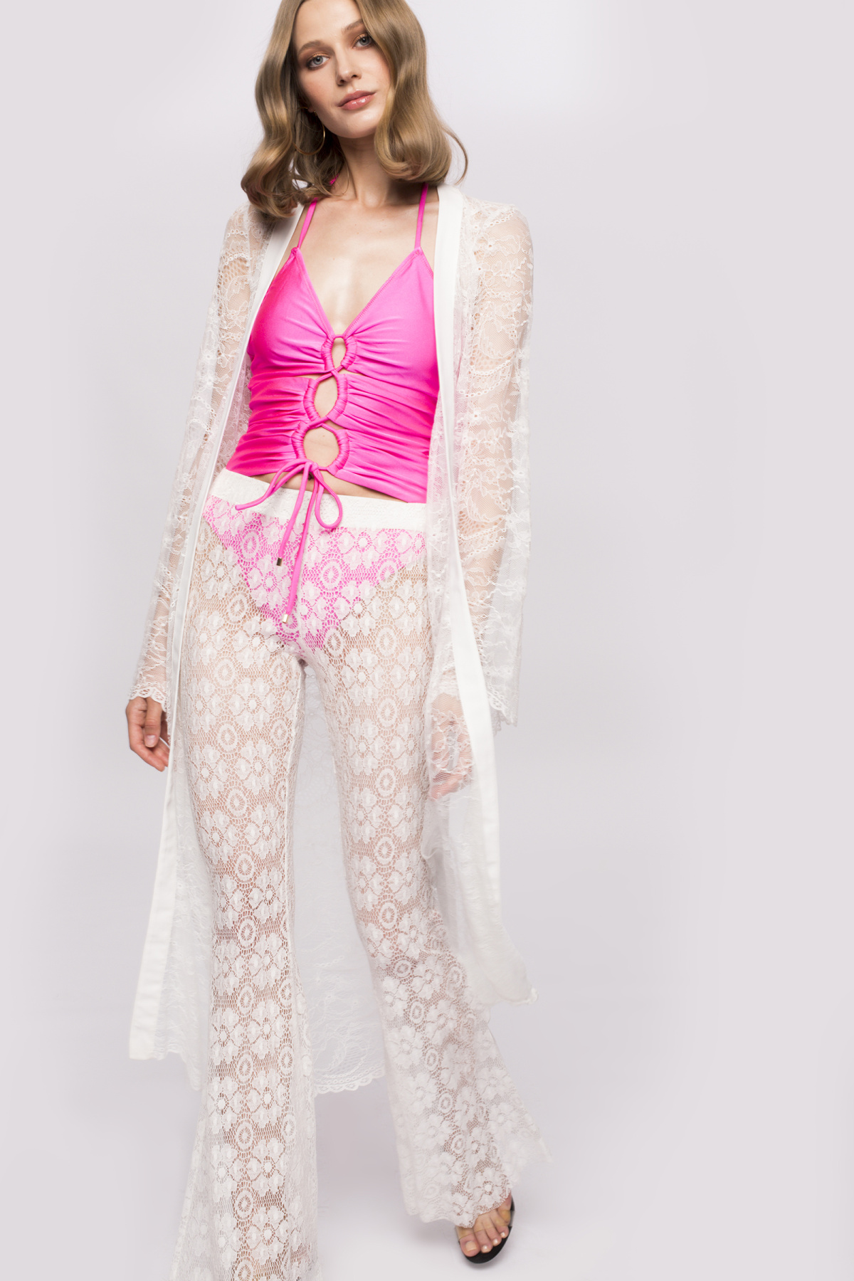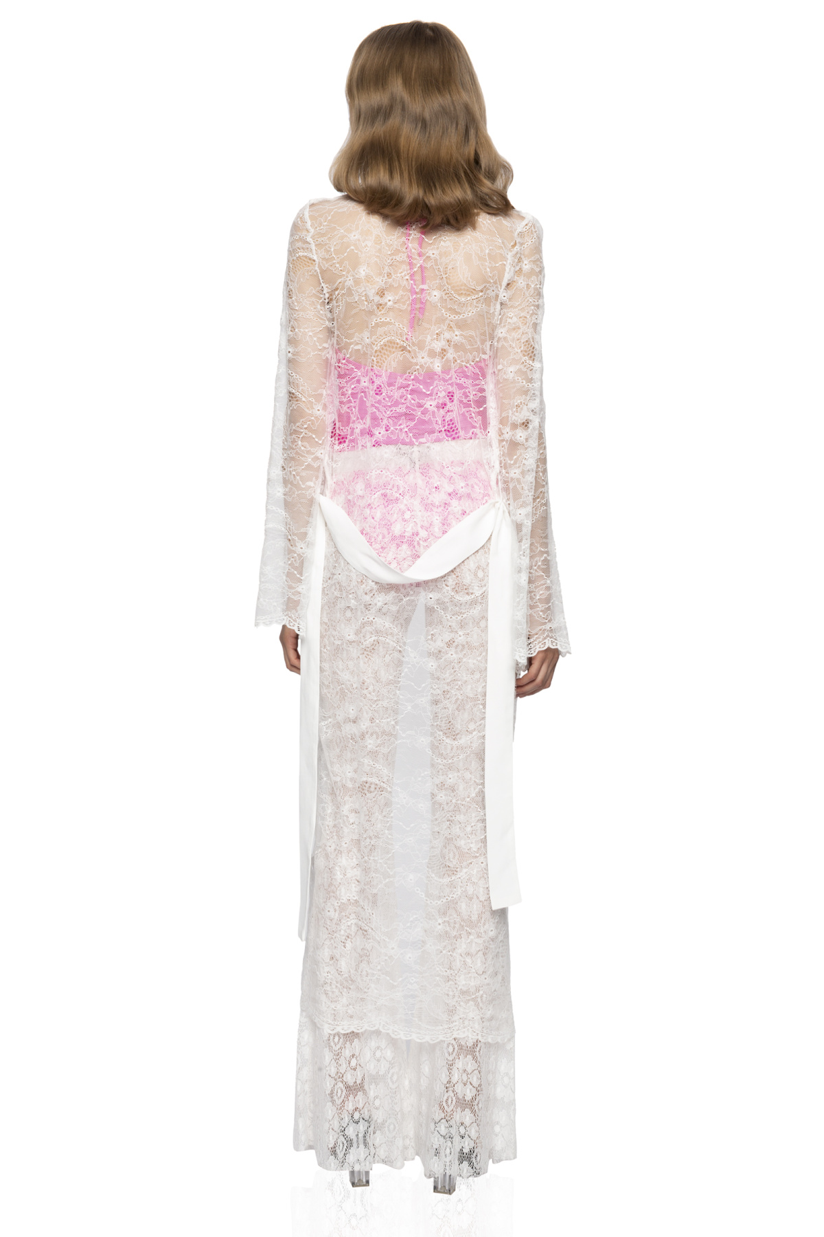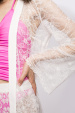 Modelul poarta masura 36, dimensiuni model: 174 cm inaltime, 81 cm bust, 59 cm talie, 87cm sold