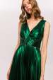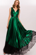 Detalii produs Rochie eleganta, verde lucios, cu dantela pe spate si la baza de jos a rochiei. Detalii argintii aplicate pe bust.