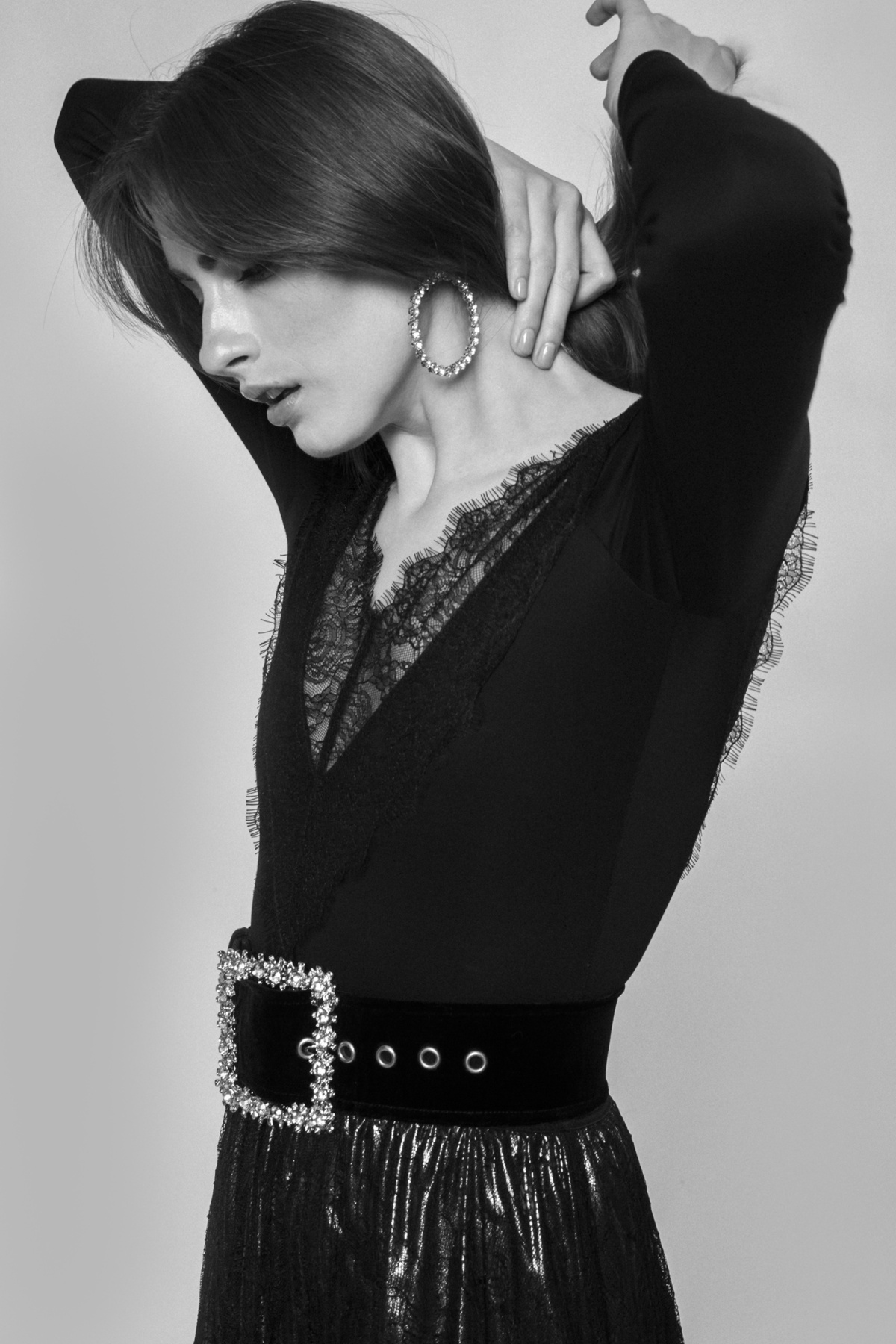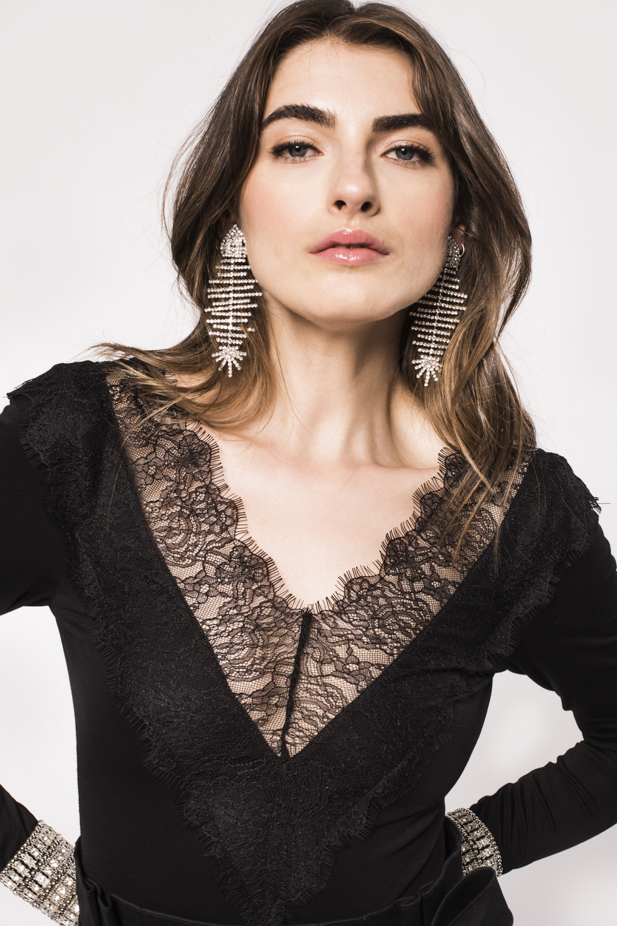 Modelul poarta masura 38, dimensiuni model: 182 cm inaltime, 84 cm bust, 62 cm talie, 91 cm sold
