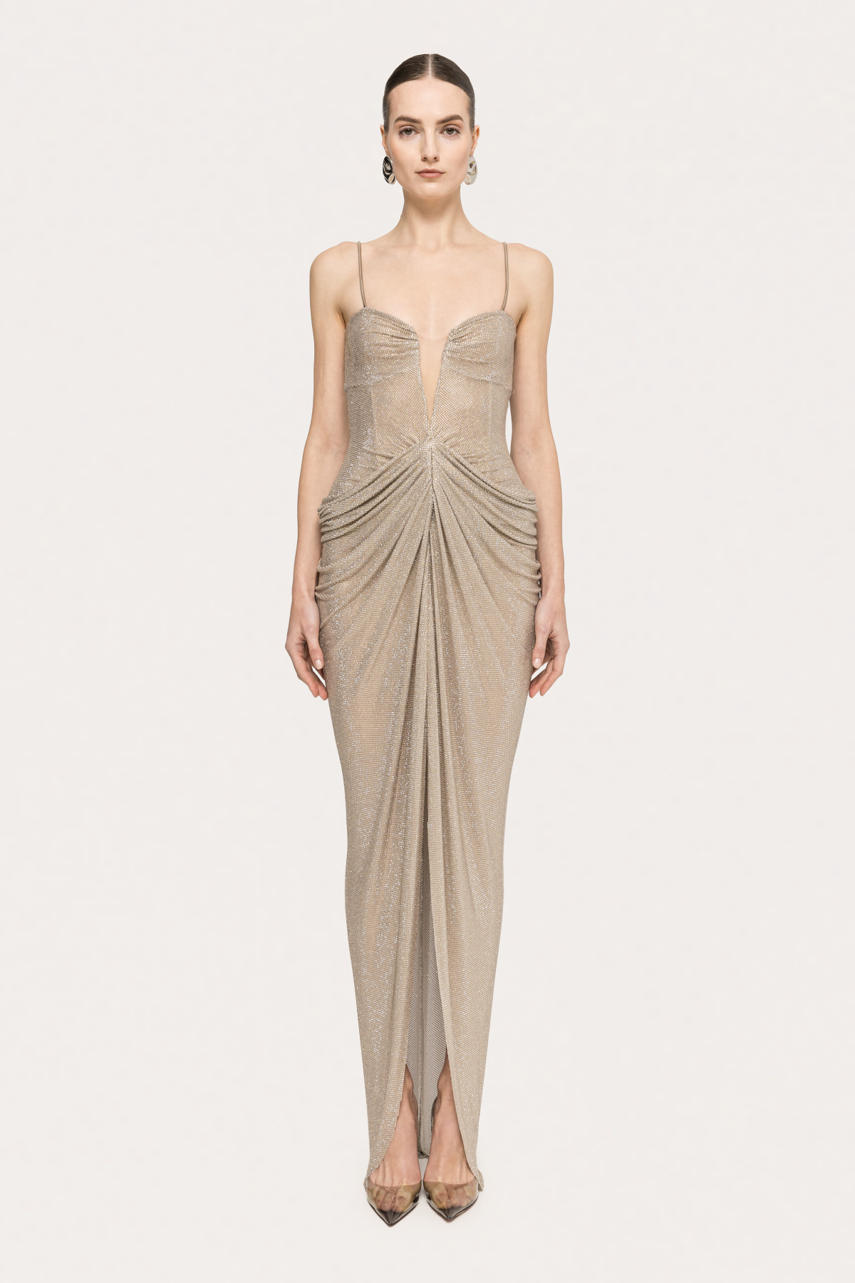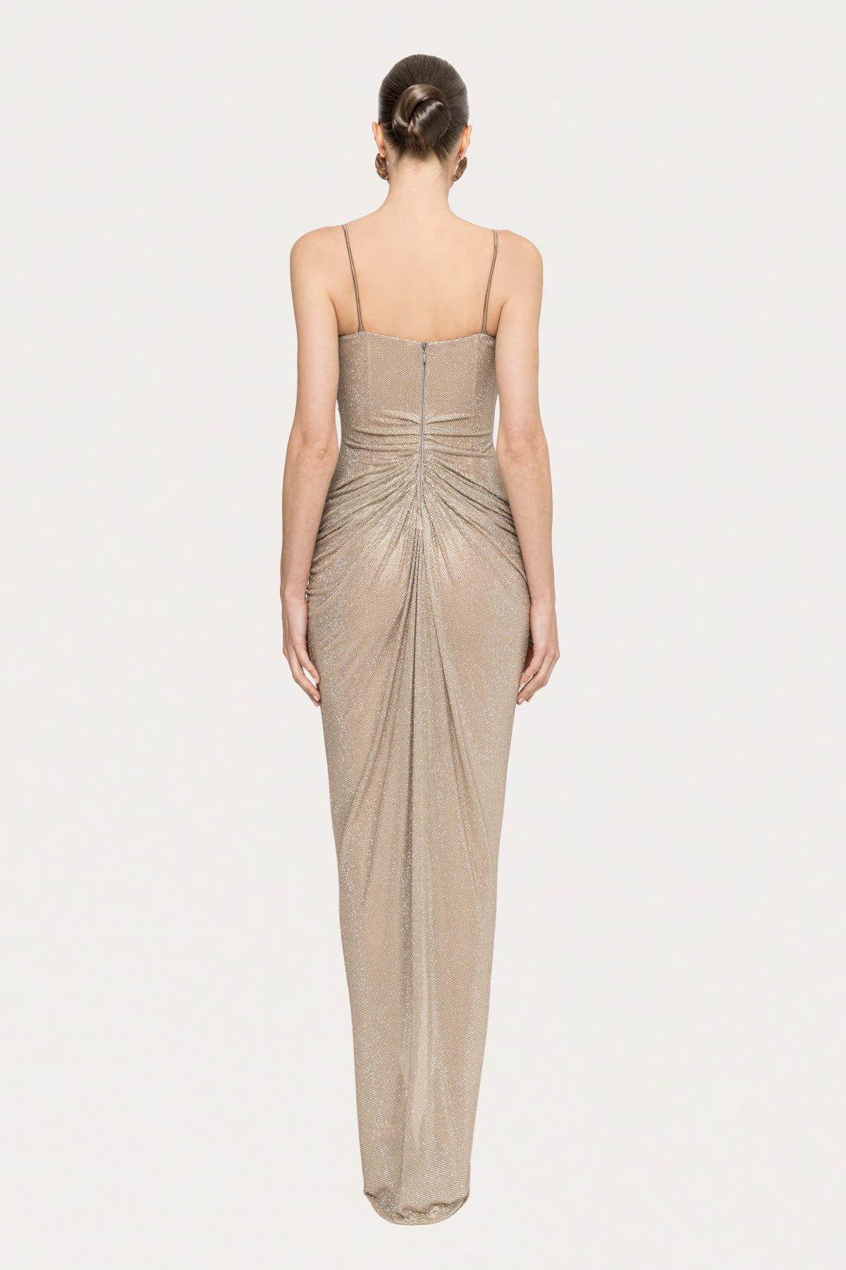 Modelul poarta masura 36, dimensiuni model: 179 cm inaltime, 84 cm bust, 59 cm talie, 88 cm sold