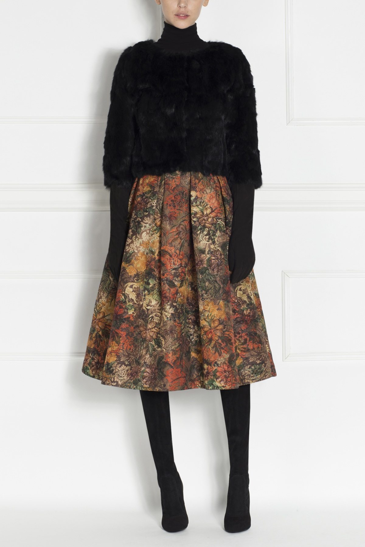 Fusta midi forma A cu imprimeu floral in nuante calde, se aseaza perfect in talie si creaza idea de falduri, scotand in evidenta liniile corpului. Accesorizeaz-o cu un top in culoare si poarta o pereche de cizme inalte pentru a contura si mai bine intreaga tinuta.